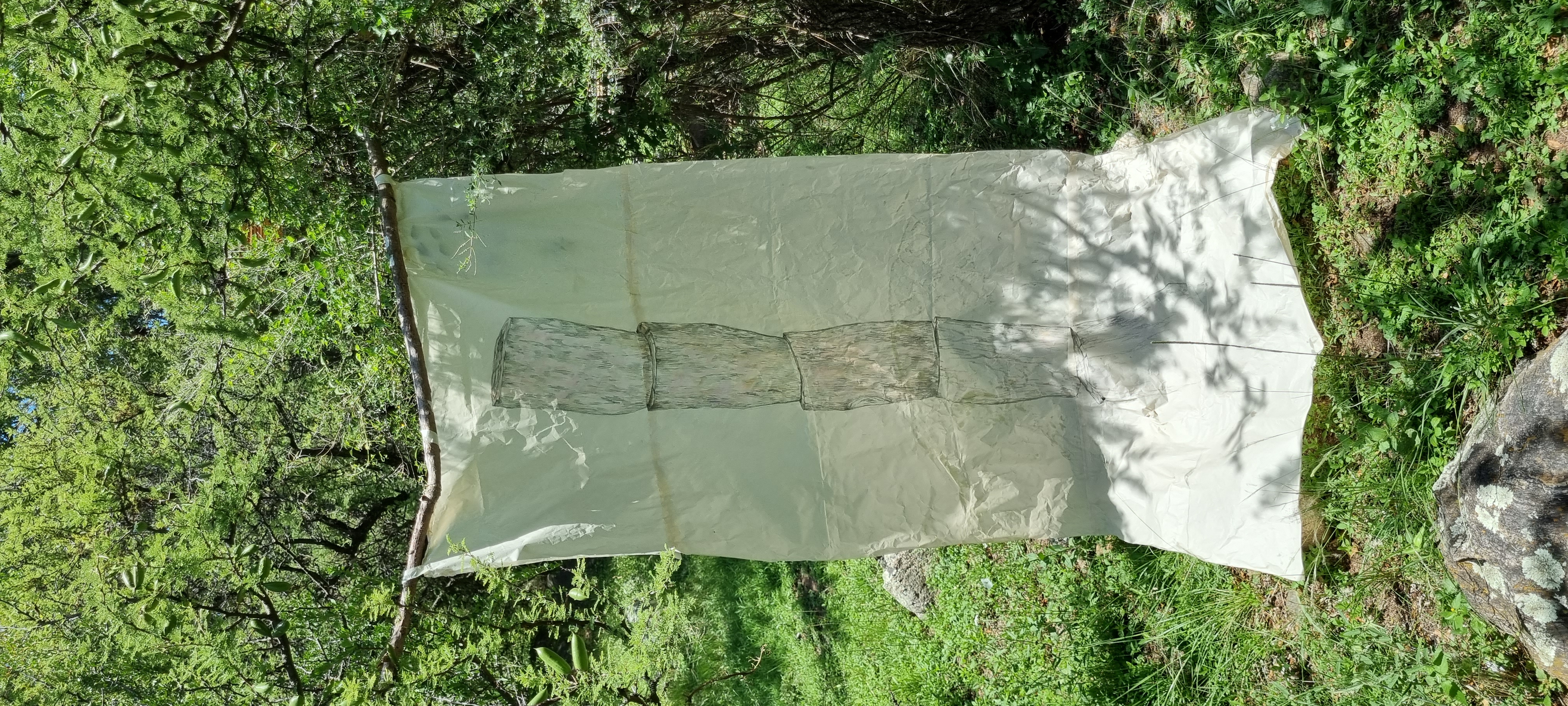 Sobre el equilibrio II, lápiz sobre papel de moldería y ramas recubierts en pulpa de papel , 200 x 70 cm